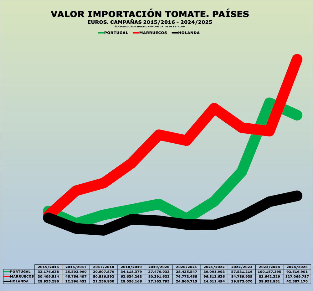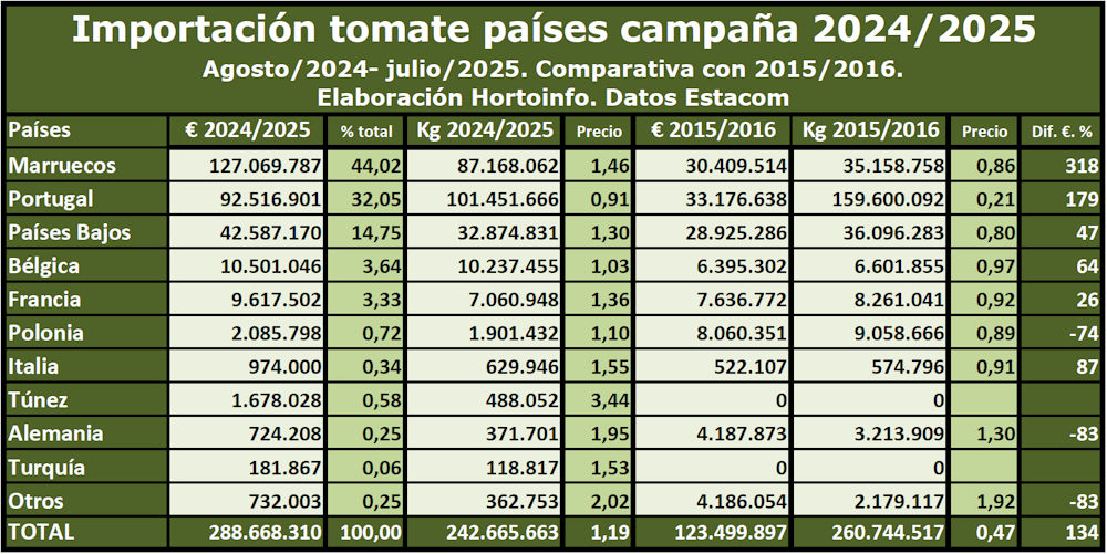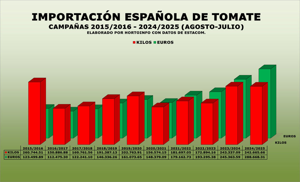 En la campaña 2024/2025 España ha pagado a otros países la cifra más alta de la historia por comprarles tomate, un total de 288,67 millones de euros por 242,66 millones de kilos, pagados a un precio medio de 1,19 euros por kilo según recoge el informe que ha elaborado Hortoinfo utilizando datos del servicio estadístico Estacom (Icex-Agencia Tributaria), con código 0702 del Arancel Integrado de las Comunidades Europeas – TARIC, cifras correspondientes al periodo comprendido entre el 1 de agosto y el 31 de julio de cada campaña.