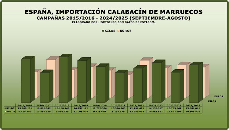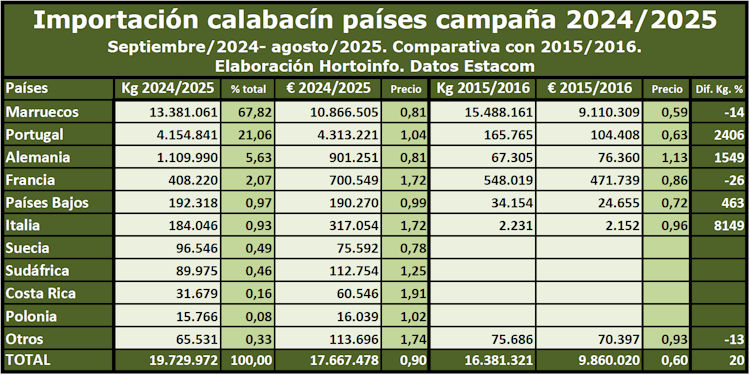 En la campaña 2024/2025 el volumen total de calabacín comprado a otros países por los operadores españoles ha sido de 19,73 millones de kilos, por un valor de 17,67 millones de euros. Las compras a Marruecos han supuesto el 67,82 % del total, seguido por Portugal con el 21,06%