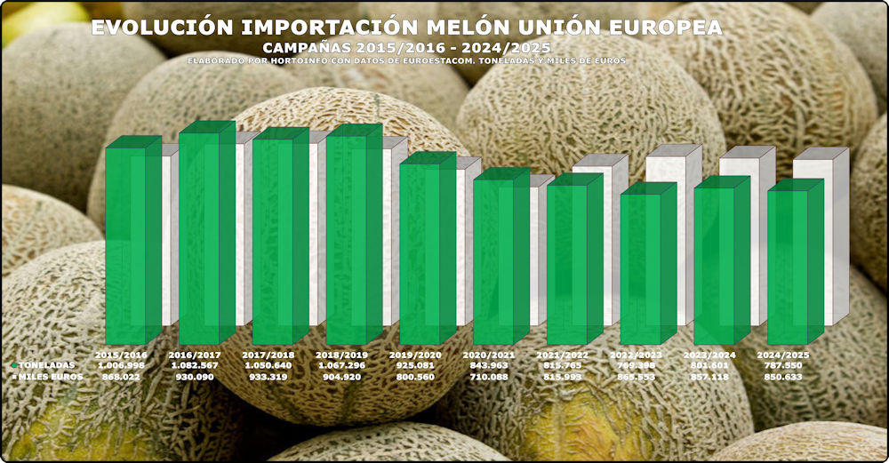 El volumen total de melón importado por los Estados miembros de la UE durante la campaña 2024/2025, desde el 1 de septiembre de 2024 al 31 de agosto de 2025, ha sido 787,55 millones de kilos comprados por un valor de 850,63 millones de euros, con un precio medio pagado por esos melones de 1,08 euros por kilo.