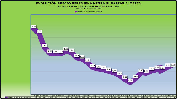 Después de que ese tipo de berenjena se vendiera el 26 de enero a un precio medio de 2,96 euros por kilo como media de las diferentes subastas almerienses, comenzó el mes de febrero con una cotización media de 1,80 euros por kilo el día dos de ese mes y de 1,90 euros por kilo el día cinco, para iniciar un proceso de caída hasta llegar a los 0,52 euros por kilo a los que la berenjena negra se vendió como precio medio el jueves día 19 de febrero. A partir de ahí se ha mantenido un crecimiento casi constante hasta cerrar el mes con una cotización media de 1,19 euros por kilo, según los cálculos realizados por Hortoinfo a partir de los cortes del precio de la berenjena negra en cada una de las subastas almerienses.