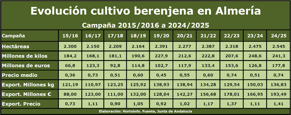 Las buenas cifras de la campaña 2024/2025 se obtuvieron a pesar de que los kilos de berenjena producidos en los invernaderos de la provincia de Almería en la pasada campaña descendieron un -2,95 por ciento con respecto a la anterior, pasando de los 248,6 millones de kilos en la campaña 2023/2024 a los 241,3 millones de kilos en la 2024/2025, gracias a que el precio medio mejoró un 45,1 por ciento con respecto a la campaña anterior y un 103,98 por ciento sobre el precio medio de la campaña 2015/2016.