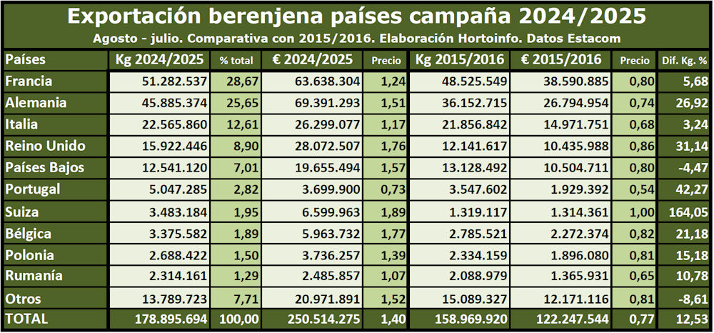 Italia aparece en la tercera posición entre los compradores de berenjena española con un volumen comprado en la campaña 2024/2025 de 22,56 millones de kilos, el 12,61 por ciento del total.