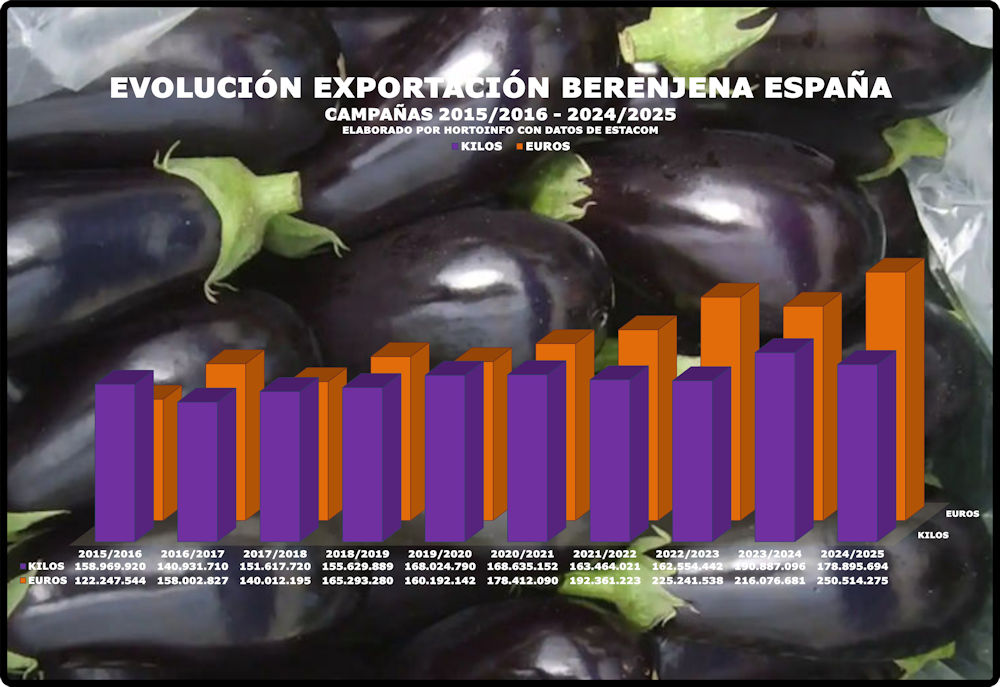 El volumen total de berenjena exportado durante la campaña, del 1 de agosto de 2024 hasta el 31 de julio de 2025, ha sido de 178,89 millones de kilos, la segunda cantidad más alta de la historia.