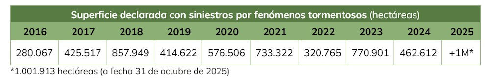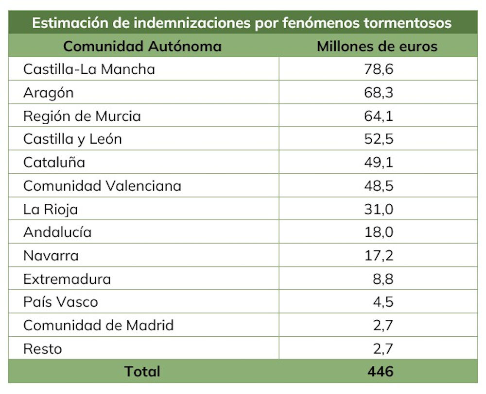La estimación de indemnizaciones por los fenómenos tormentosos alcanza los 446 millones de euros en 2025. Sumando el resto de los riesgos cubiertos por el seguro agrario, la estimación de indemnizaciones de 2025 (a 31 de octubre) alcanza los 694 millones de euros