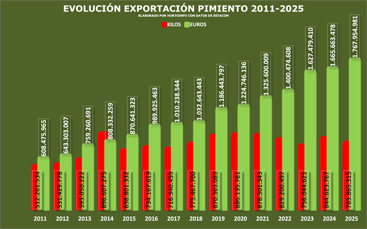 El valor que la exportación de pimiento ha aportado para mejorar la balanza comercial española en 2025 ha sido de 1.767,95 millones de euros, un 190,56 por ciento más que el valor en el año 2011. Se trata de la cifra más alta de la historia a pesar de que el volumen no haya alcanzado los niveles de 2014 cuando se exportó la cantidad de pimiento más alta de la serie histórica analizada.