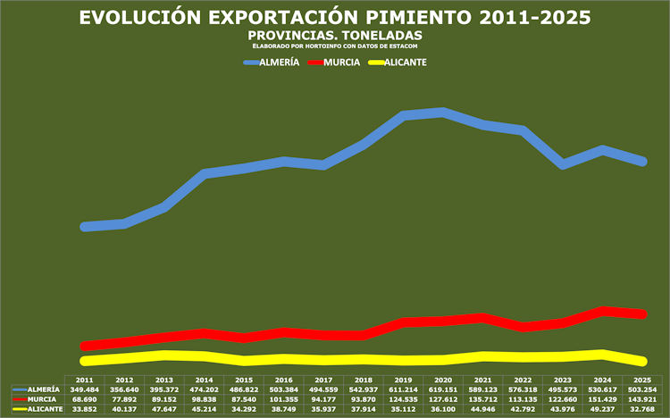Alicante fue en 2025 la tercera provincia exportadora de pimiento con un volumen de 32,77 millones de kilos, por un valor de 66,83 millones de euros y un precio medio de 2,04 euros por kilo.