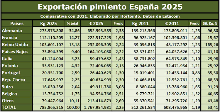 El precio medio al que España ha exportado sus pimientos en 2025 ha sido de 2,25 euros por kilo, un 89,07 por ciento más alto que el precio al que se exportaron los pimientos en 2011. Además de ser el mayor comprador de pimiento español, Alemania ha sido el país que mejor lo ha pagado de entre los cinco mayores compradores, con un precio medio de 2,38 euros por kilo, seguido por Reino Unido con 2,24 euros el kilo.