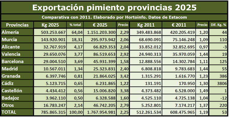 Incluso con la reducción de un 6,96 por ciento con respecto a 2024, el volumen total de pimiento exportado por España en 2025 se ha incrementado en un 53,41 por ciento con respecto a las exportaciones de 2011, cuando el volumen de pimiento español enviado a los mercados exteriores fue de 512,26 millones de kilos.