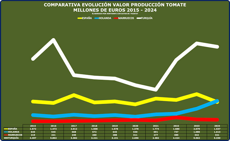 Una comparativa del valor del tomate producido en 2024 por España, Holanda, marruecos y Turquía, arroja el dato de que Holanda supera por primera vez a España al alcanzar los 16.613 millones de euros, mientas que España baja de 2.079 a 1.537 millones de euros