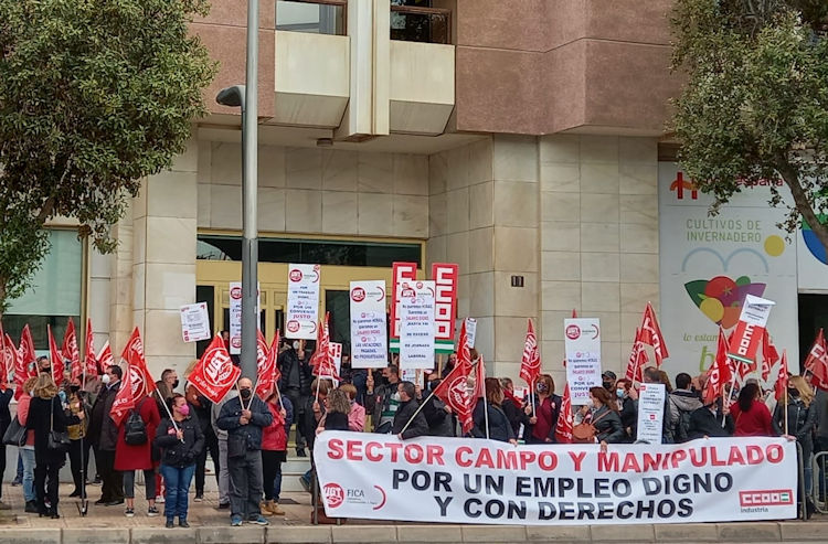 La concentración ha sido convocada para hoy martes por los sindicatos CCOO y UGT, para protestar por la falta de avances en la renovación del convenio colectivo del sector del manipulado hortofrutícola, que emplea a unas 30.000 personas en la provincia